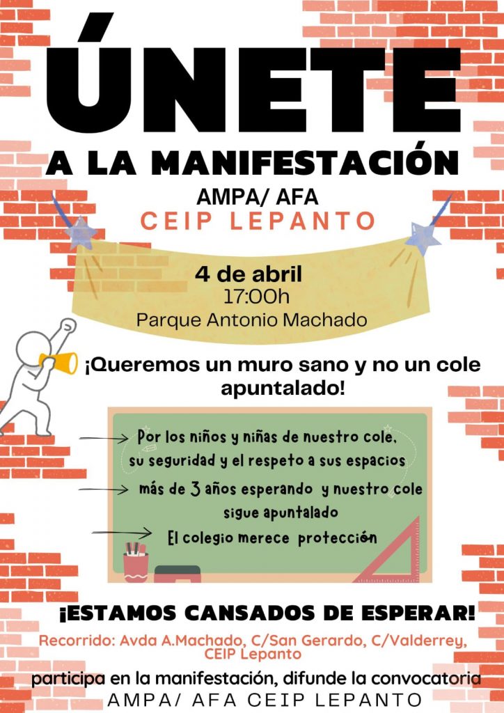 Ante la pasividad por parte del Ayuntamiento para resolver este grave problema, el AMPA del CEIP Lepanto ha optado, como señal de protesta, convocar una manifestación el próximo viernes 4 de abril a las 17:00 h, que saldrá del parque público de Antonio Machado, la cual desde la A.VV. Poetas apoyamos plenamente y os invitamos a que apoyeis acudiendo a la manifestación.